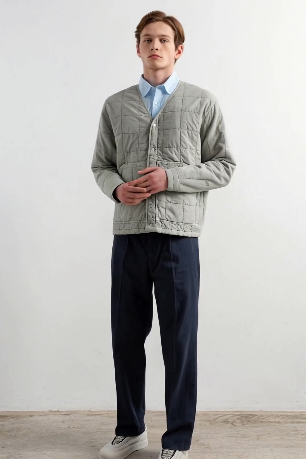 Veste taupe en coton teint en pièce avec finition surjetée. Légèrement matelassée. Motif à carreaux et col en V.